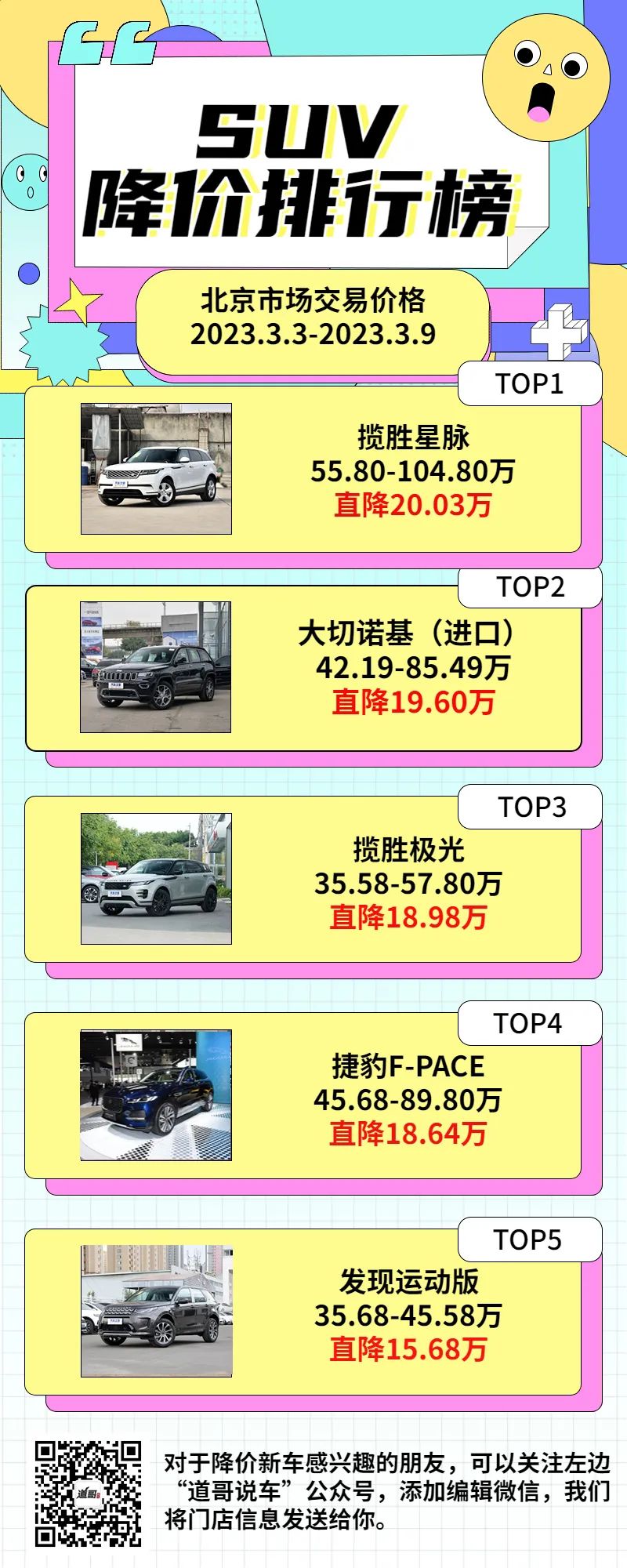 同样关注度较高的SUV车型方面,本周的降价力度还是很大的。揽胜星脉以直降20.03万的价格排在第一位,紧随其后的大切诺基(进口)直降19.60万,揽胜极光和捷豹F-PACE分别直降18.98万和18.64万,排在第五位的发现运动版也直降了15.68万。可以看到的是,整个降价车型以捷豹路虎品牌为主。