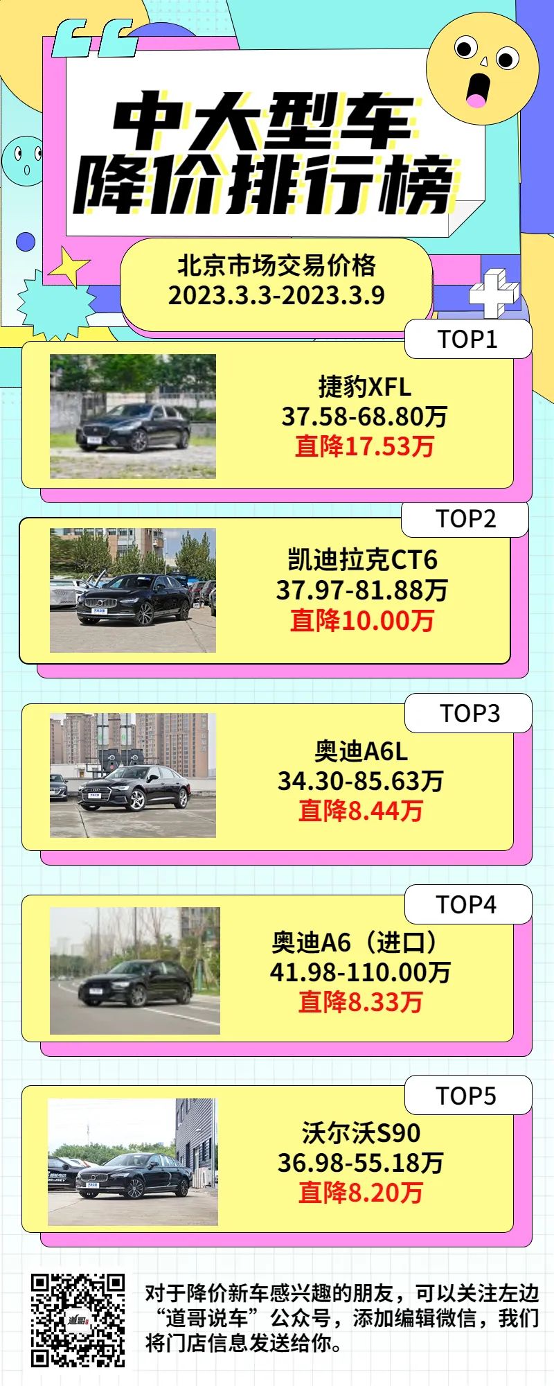 中大型车方面,连续好几周排名第一位的捷豹XFL本周又降价了,直降17.53万还是非常让人心动的,同样上周入榜的凯迪拉克CT6本周降价幅度并没有发生变化,不过沃尔沃S90与上周相比降价幅度没有那么大了。值得一提的是,奥迪A6(进口)和奥迪A6L破天荒的跻身降价榜,分别直降8.44万和8.33万。