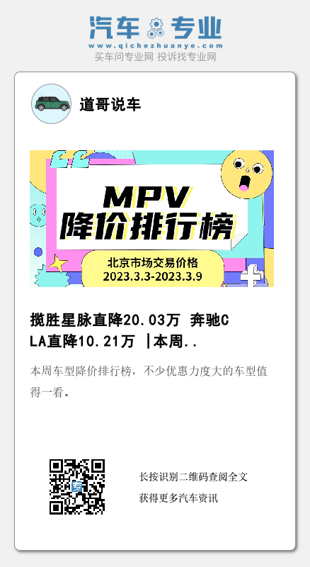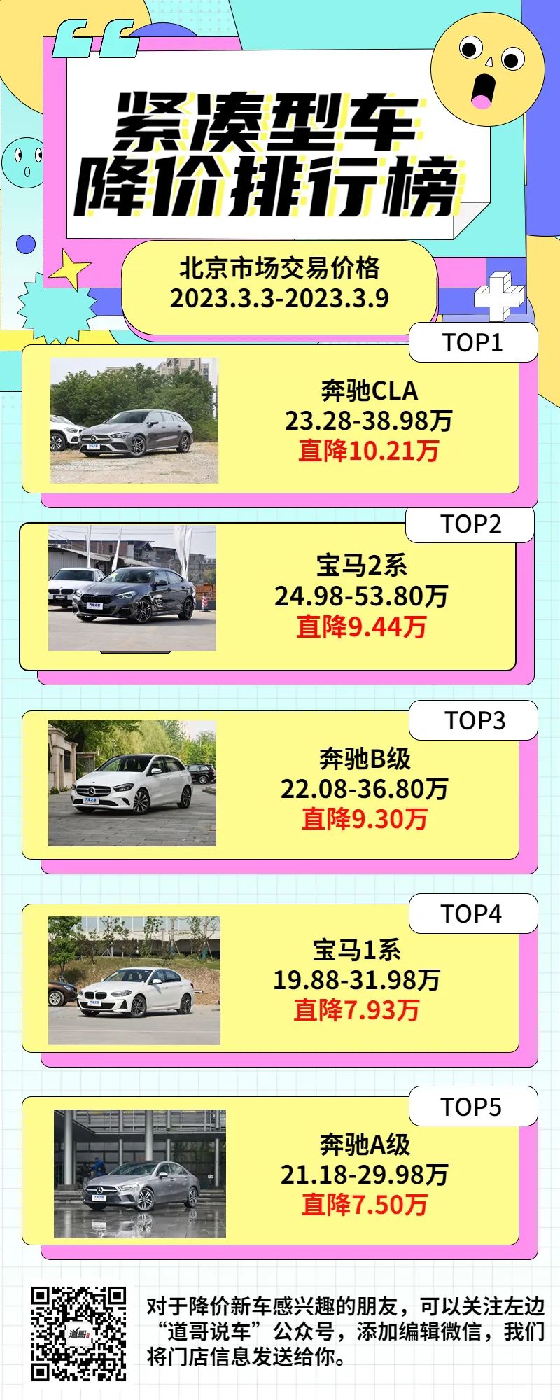颇受关注的紧凑型车方面,奔驰CLA不仅入榜,还以直降10.21万的力度排在第一位,其他四个入榜的车型,除了奔驰A级降价幅度与上周有一点差距,其他三款车型降价幅度与上周基本一致。