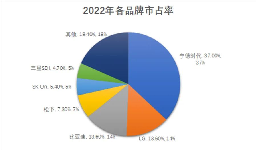 宁德时代是全球最大的动力电池供应商,靠着绝对优势被称作“宁王”。2022年,宁德时代电池总装车量达191.6GWh,同比增长92.5%,市场份额由2021年的33%上升至37%。