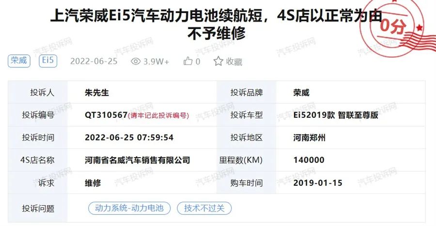海南的许先生说,上汽荣威Ei5动力电池衰减严重,实际使用续航与销售宣传的不符,存在欺诈消费者行为。