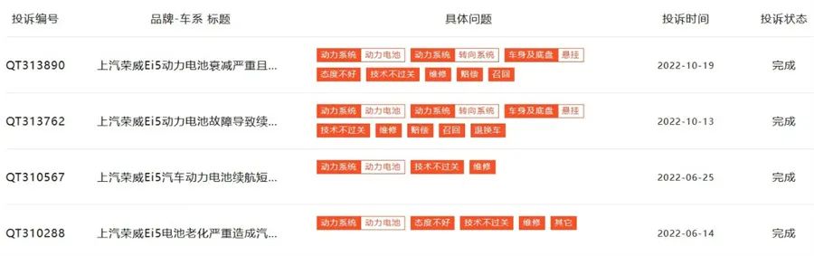 其中理想、哪吒、蔚来、AITO在汽车投诉网上并无有关动力电池的投诉,荣威Ei5有四条相关搜索结果(只显示2021年之后的投诉)。