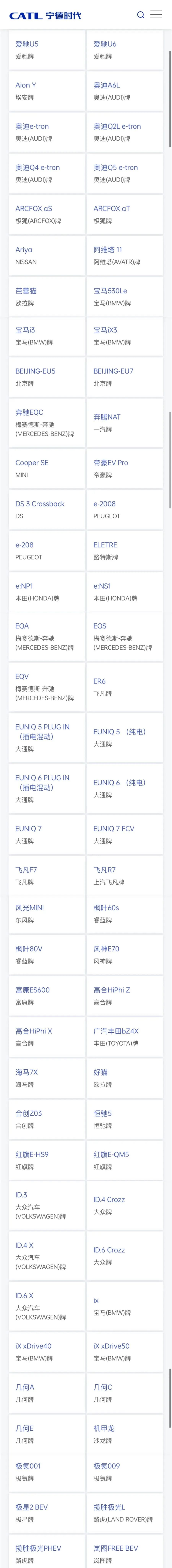 宁德时代为68家品牌共149款车型提供动力电池。其中为人所熟知的有理想(L7、L8、L9、ONE),奥迪A6L,哪吒(S、U、V),荣威(Ei5、ei6 Max BEV),蔚来(EC6、ES6、ES7、ES8、ET5、ET7),AITO(问界m5、m7),特斯拉(model 3/Y)等。