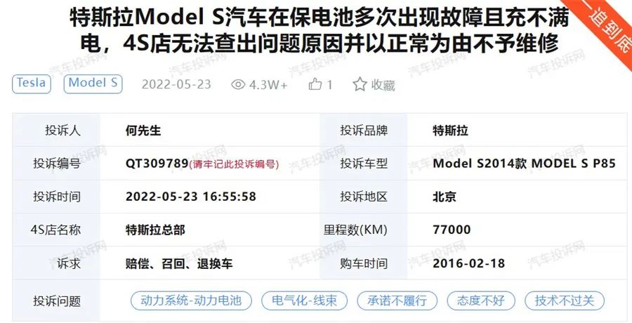 在Model S动力电池故障方面,北京的何先生表示,他一直使用特斯拉的超充,原本1小时40分钟能充满的电,在使用5年后,3个小时怎么也充不满,同时车辆提示电池故障,但故障原因4S店无法查出。