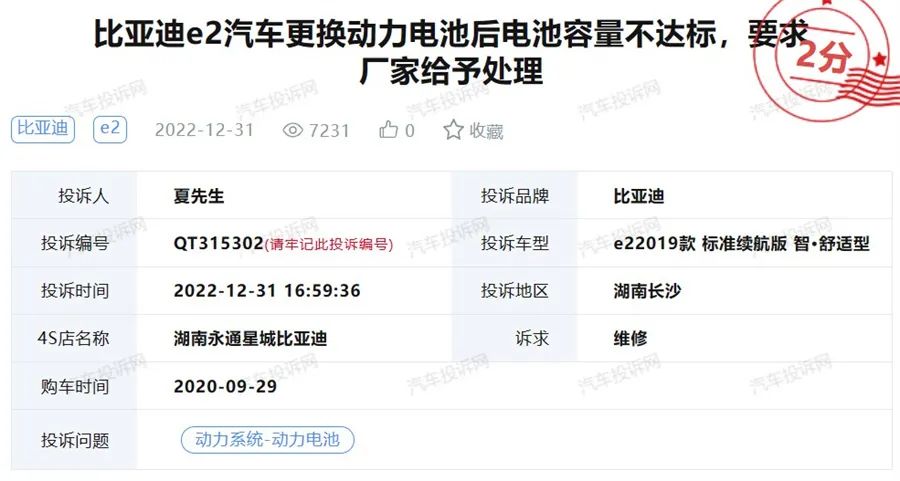 除了常见的电池续航衰减严重的共性问题,湖南的夏先生在使用中发现车辆的电池容量一直达不到标准容量35度电,工作人员进行了重新标定,还是达不到要求。经店里测试实际充电量只有27-28度电,比标准容量35度电少了将近四分之一,更换新电池后,经测试还是只有27-28度电。比亚迪4S店表示没有办法了,比亚迪厂家发的电池就是这样。