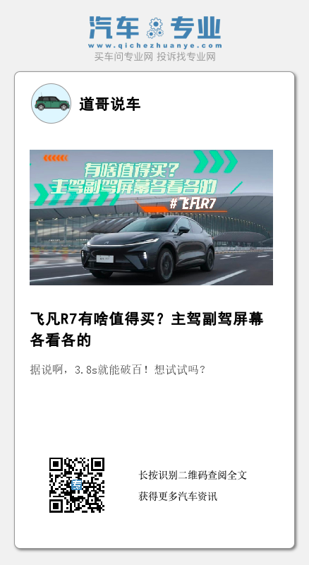 女朋友爱看言情剧,但你想看NBA,你顺着她你心里闹挺,让她顺着你你日子闹挺,咋整!飞凡R7考虑你所考虑的,两块屏幕分开看,各看各的互不干涉,既能坐在一起贴贴,又能看各自想看的内容,这真是为缓解家庭矛盾做出了突出贡献。听说这台车还能做到,当你走近,它可以自动开门迎接,你下车它还能自动锁车,厉害吧!更厉害的是据说,据说啊,3.8s就能破百!想试试吗?