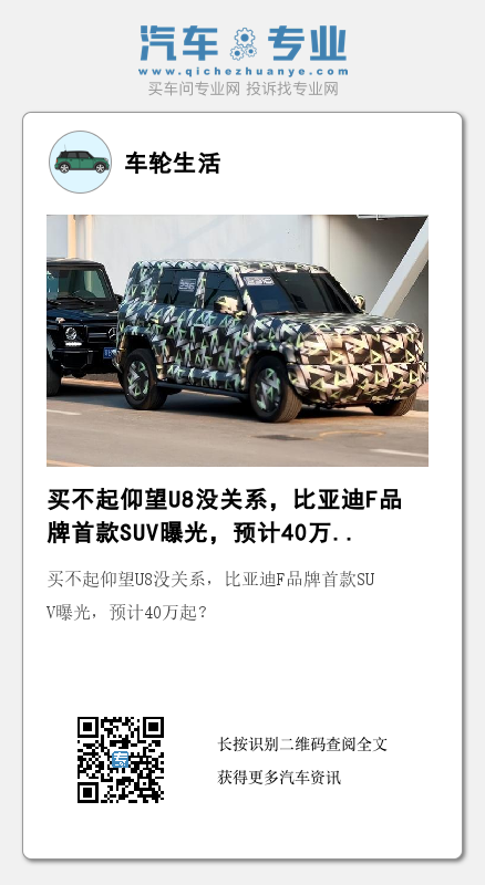 不过,根据之前的消息来看,F品牌预计会在腾势和仰望之间,价格上面和BBA全面看齐,主打的是多品类、独特性的专业级新能源车型。这不,就在最近,F品牌曝光了旗下的第一款新车,这款车型的内部代号是SF,定位上是硬派越野SUV,价格或在40-60万元之间。在产品力上对标的车型是奔驰大G。