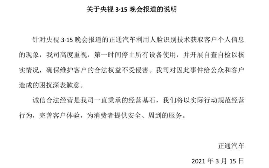 针对央视315报道的人脸识别获取客户人个人信息现象,国内知名汽车经销集团正通汽车回应称,第一时间停止所有设备使用,并开展自查自验以核实情况,确保维护客户的合法权益不受侵害。我司对因此时间给公众和客户造成的困扰深表歉意。
