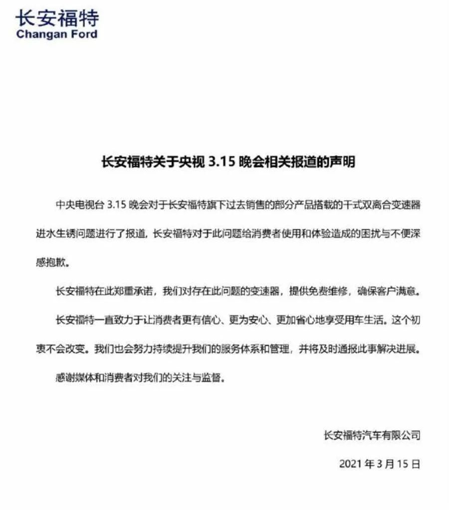 晚会后,长安福特发表了一份声明,称会对存在这类问题的变速箱提供免费维修。