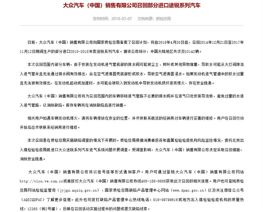 在被央视“3•15”晚会曝光后,大众回应,公司高度重视中央电视台“3•15”晚会报道的关于大众进口汽车途锐的车辆问题,并充分意识到在处理客户诉求过程中仍存在诸多不足。针对上述缺陷问题,公司已向国家相关部门备案了召回计划,同时针对该问题开设“专属通道”,由售后人员为车主提供一对一的沟通。