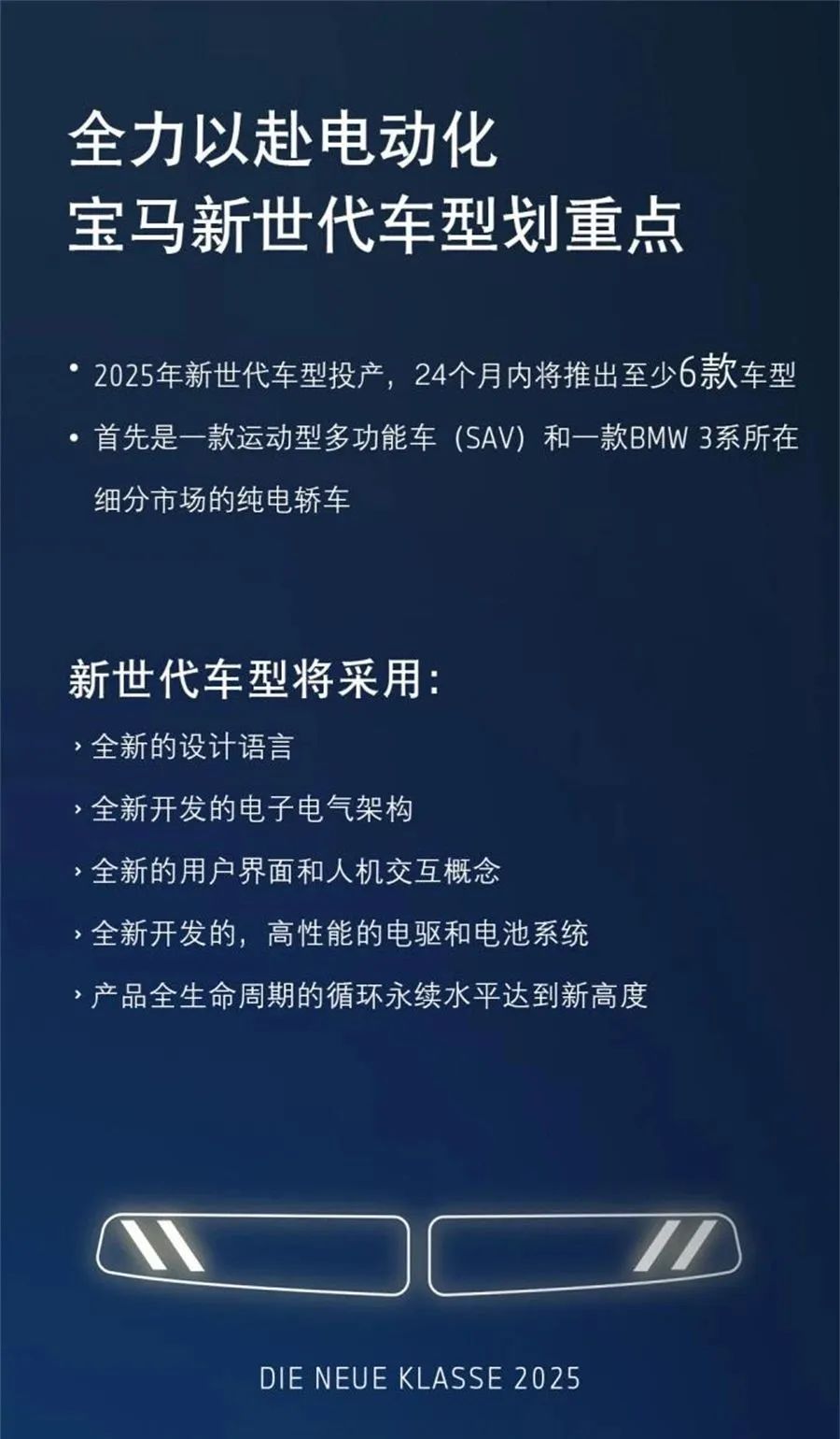 值得一提的是,在本次财报年会上,宝马集团还首次披露了其新世代车型的产品规划。按照计划,宝马集团将从2025年下半年开始投产新世代车型,走量车型将打头阵。在随后的24个月内,将有至少6款新世代车型实现量产。包括一款运动型多功能车(SAV)和一款BMW 3系所在细分市场的纯电轿车。也就是说,新世代车型的首发阵容将专注在宝马品牌的核心细分市场。