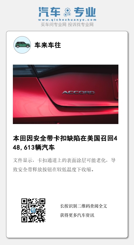 据外媒报道,本田美国分公司表示,将在美国召回448,613辆汽车,并在加拿大、墨西哥、巴拿马和圣马丁也召回部分汽车,原因是安全带扣可能无法正常锁紧。