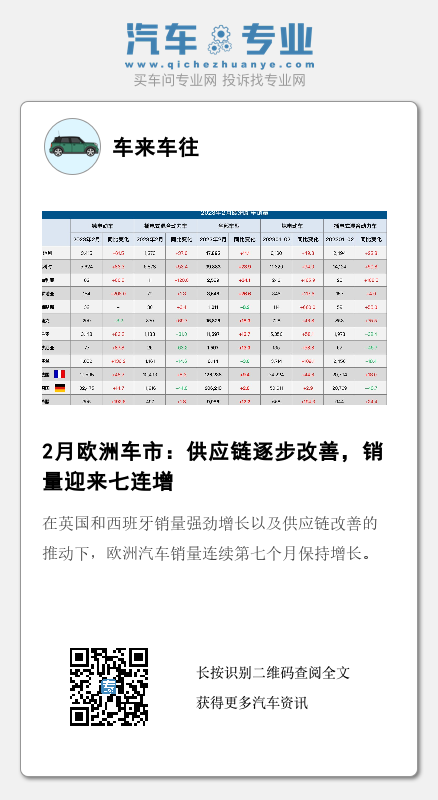 3月21日,欧洲汽车制造商协会(ACEA)公布,欧洲2月新车注册量为902,775辆,同比增长12%。在英国和西班牙销量强劲增长以及供应链改善的推动下,欧洲汽车销量连续第七个月保持增长。
