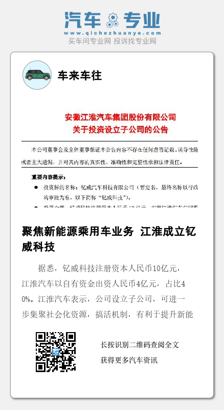 日前,江淮汽车发布关于投资设立子公司的公告:“为进一步加快推进公司新能源乘用车业务发展,公司拟联合安庆新能源投资发展有限公司、钇威科技核心团队持股平台安庆开物管理咨询合伙企业(有限合伙),以及江苏龙蟠科技股份有限公司等5家战略投资者,共同成立钇威汽车科技有限公司(暂定名,最终名称以行政机构审批为准)。”