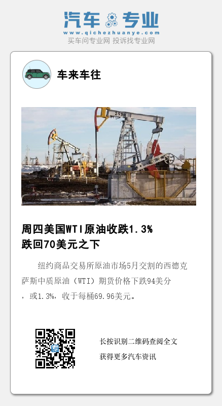 纽约商品交易所原油市场5月交割的西德克萨斯中质原油(WTI)期货价格下跌94美分,或1.3%,收于每桶69.96美元。