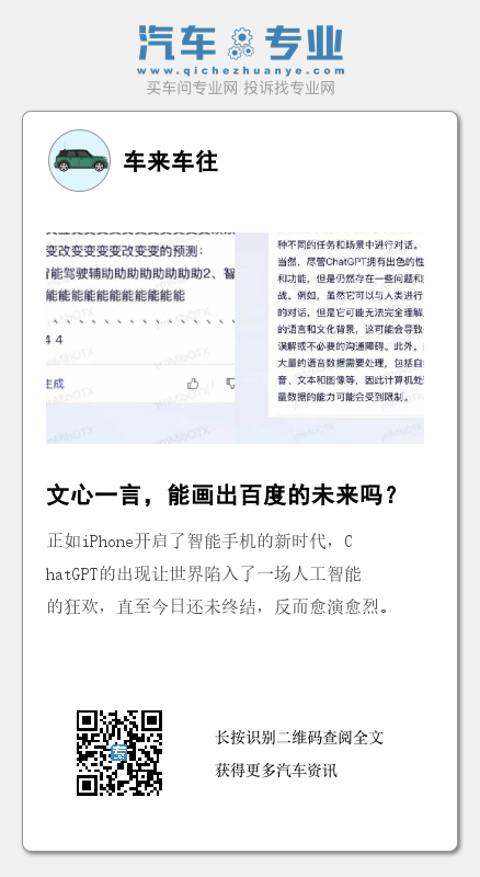 从各大车企的角度来看,接入文心一言这类产品将成为他们打造差异化竞争的绝佳渠道。