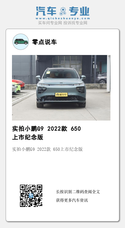 新能源是当下汽车领域极具话题性的板块,内涵颇多新起品牌,以更快的更新频率设立,努力争抢市场中的热度,小鹏汽车就是表现较为活跃的品牌之一,旗下款式多处于高端豪华领域之中,2022年9月推出了小鹏G9(图片|配置|询价) 2022款 650上市纪念版,中大型SUV,纯电动能源类型。