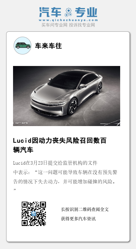 Lucid在3月23日提交给监管机构的文件中表示:“这一问题可能导致车辆在没有预先警告的情况下失去动力,并可能增加碰撞的风险。”