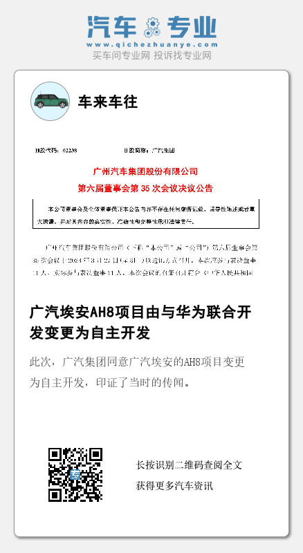 3月27日,广汽集团发布的《第六届董事会第35次会议决议公告》中提到,董事会审议通过了《关于广汽埃安 AH8项目变更的议案》,同意控股子公司广汽埃安的“AH8项目”由与华为联合开发变更为自主开发,本次变更后华为将继续以重要供应商身份参与公司自主品牌车型的开发及合作。