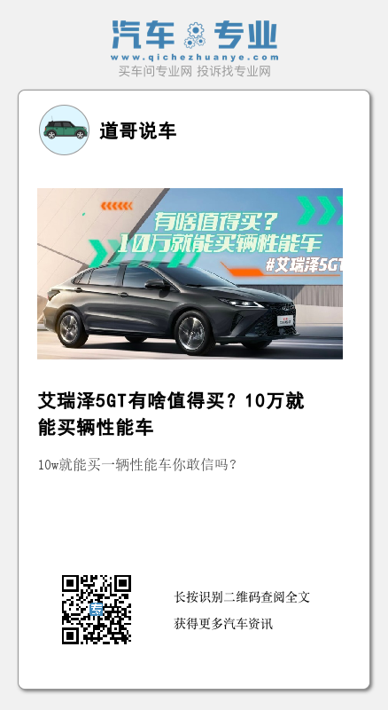 10w就能买一辆性能车你敢信吗?今天咱们聊聊艾瑞泽5GT!这款车可以说是草根性能车,平民小钢炮!这款车定位为一款紧凑型轿车,新车外观与在售车型相同,大面积格栅中多了GT专属红色标识,增强运动感。在提供原有1.6T动力的基础上,新增1.5T版本车型,峰值输出115kW、230N·m,这动力还是很给力的。新车还配备同级最多的14项L2+级智能驾驶辅助系统,科技感拉满。售价区间为7.99-10.99万元。你觉得值吗?