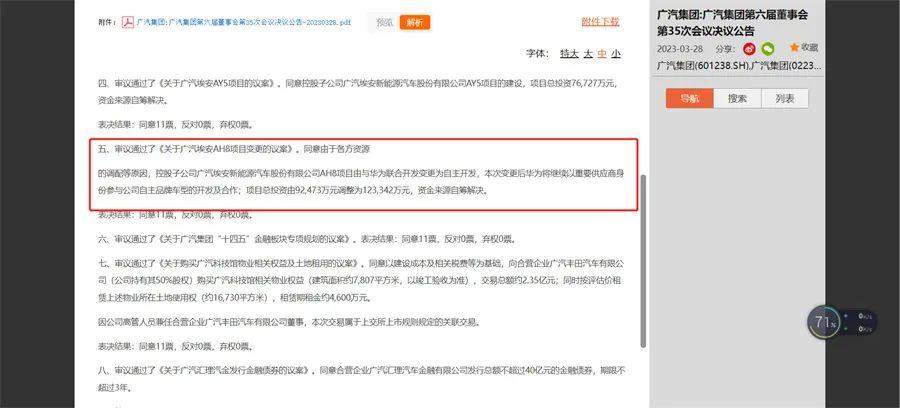 【文/道哥说车 听风吟】日前,广汽集团发布公告称,公司控股子公司广汽埃安AH8项目由与华为联合开发变更为自主开发,本次变更后华为将继续以重要供应商身份参与公司自主品牌车型的开发及合作。与此同时,项目总投资由9.25亿元调整为12.33亿元,资金来源为自筹解决。