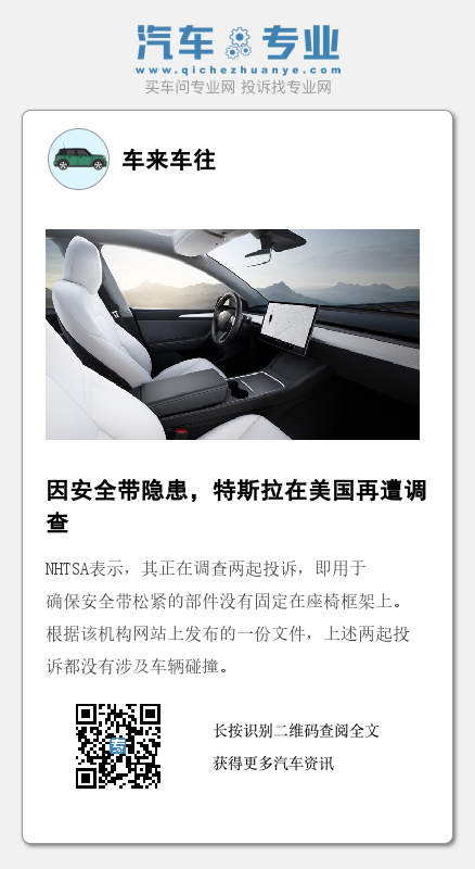 NHTSA表示,其正在调查两起投诉,即用于确保安全带松紧的部件没有固定在座椅框架上。根据该机构网站上发布的一份文件,上述两起投诉都没有涉及车辆碰撞。