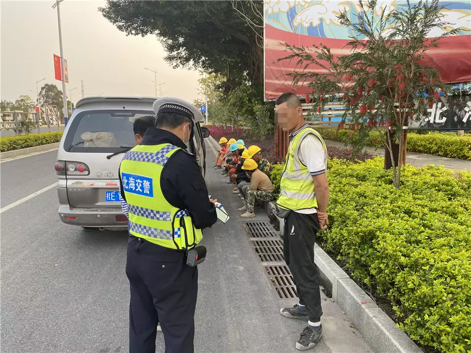 3月7日17时许,北海市公安局交通警察支队第二大队民警在北海大道与向海大道交会路口附近执勤时,发现一辆普通客车向执勤点驶来。从远处看,该车车身明显下沉,有超员嫌疑。