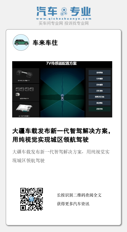 2023年4月2日,大疆车载在『中国电动汽车百人会论坛(2023)』上公布了全新一代智能驾驶解决方案,该方案以低至32TOPS的算力,7V/9V的纯视觉配置,通过“强视觉在线实时感知、无高精地图依赖、无激光雷达依赖”实现了包括城区记忆行车(32TOPS)/ 城区领航驾驶(80TOPS)在内的L2+智能驾驶功能。