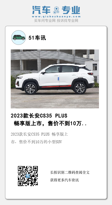 写在最后,2023款长安CS35 PLUS 畅享版定位为小型SUV,新车的外观设计变化不大,但设计细节有所优化和提高,长安CS35 PLUS在市场上认可度比较高,其销量相对稳定,预算10万元,买家用车,你会选它吗?欢迎在评论区留言交流。