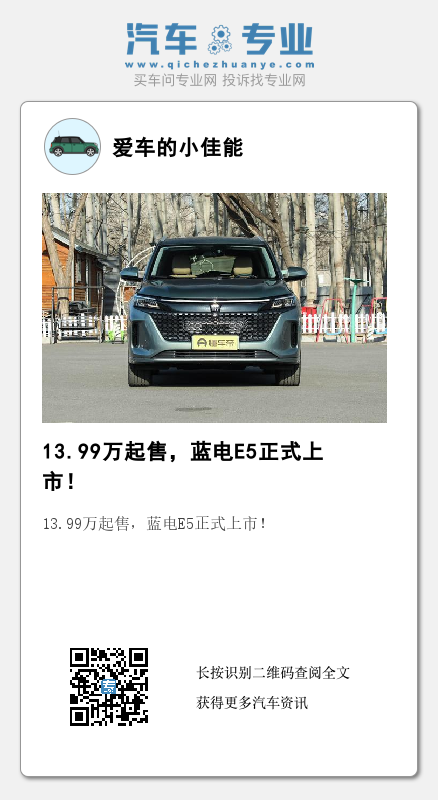 3月30日,蓝电E5(图片|配置|询价)正式上市,新车共推出2款车型,售价区间为13.99-15.19万元。新车定位中型SUV,内部配备7座布局,将搭载HUAWEI Hicar3.0车机,并将采用插电式混合动力系统。同时,重庆赛力斯蓝电汽车有限公司正式成立,全新品牌蓝电也正式发布。