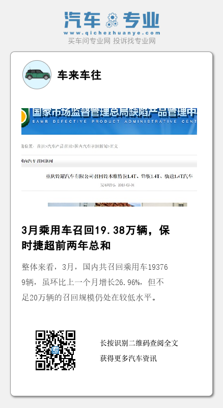 整体来看,3月,国内共召回乘用车193769辆,虽环比上一个月增长26.96%,但不足20万辆的召回规模仍处在较低水平。