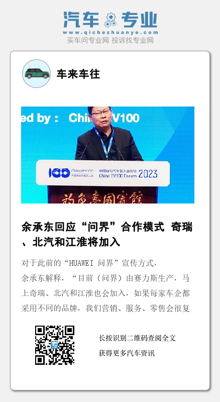 对于此前的“HUAWEI 问界”宣传方式,余承东解释,“目前(问界)由赛力斯生产,马上奇瑞、北汽和江淮也会加入,如果每家车企都采用不同的品牌,我们营销、服务、零售会很复杂,所以希望采用共同的元素和品牌。如‘HUAWEI 问界’。”