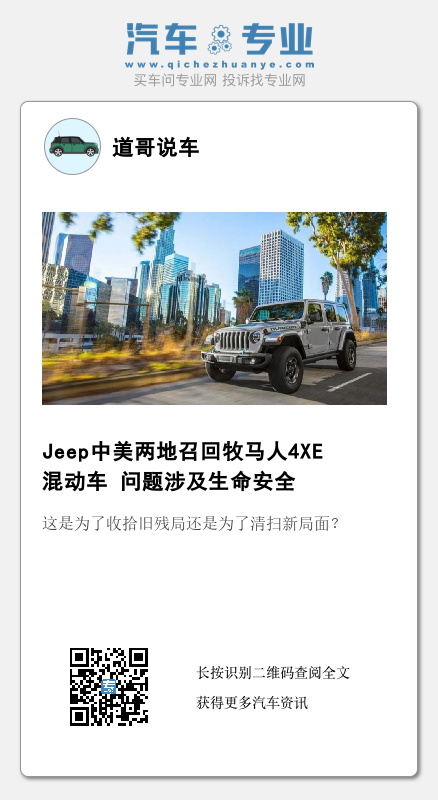 【文/财圈社&道哥说车 张越】去年11月,广汽菲亚特克莱斯勒汽车有限公司向湖南省长沙市中级人民法院正式申请破产。这也意味着,入华16年,广汽菲克连带Jeep品牌彻底退出了中国市场。有意思的是,就在Jeep品牌退出中国市场不久后,Jeep在华两度召回了进口牧马人4XE混动车。这是为了收拾旧残局还是为了清扫新局面?