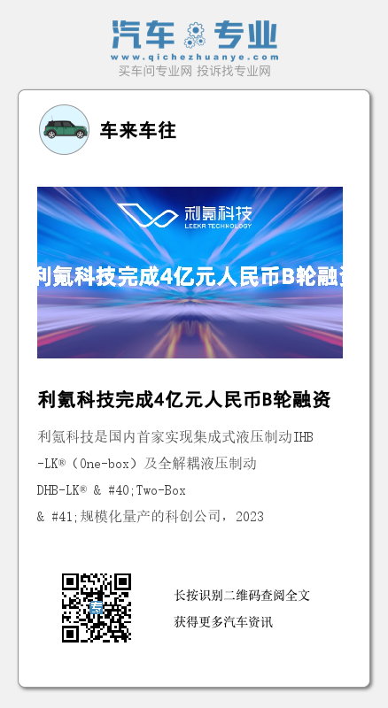 2023年4月6日,智能底盘系统方案商利氪(广州)科技有限公司(以下简称:利氪科技)宣布完成4亿元人民币B轮股权融资。公司于2022年1月成立,16个月已累计完成融资金额6亿元人民币。