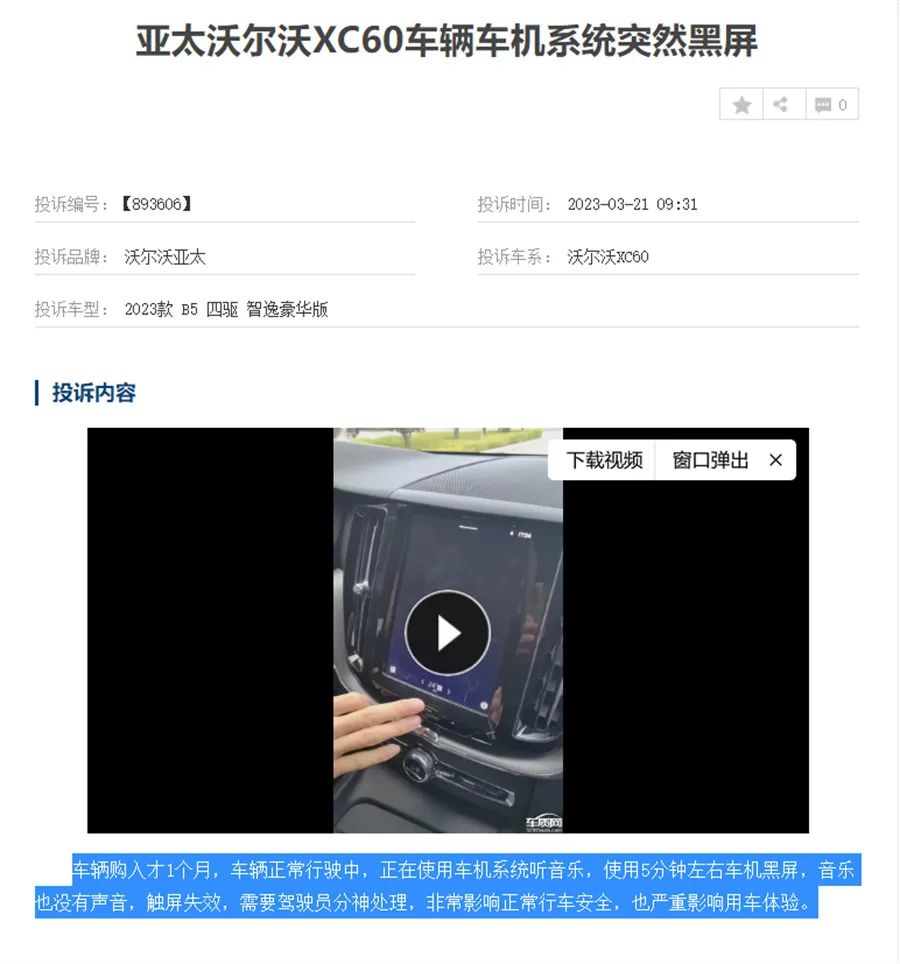 “车辆购入才1个月,车辆正常行驶中,正在使用车机系统听音乐,使用5分钟左右车机黑屏,音乐也没有声音,触屏失效”,2023款沃尔沃XC60智逸豪华版车主在车质网投诉称,需要驾驶员分神处理,非常影响正常行车安全,也严重影响用车体验。