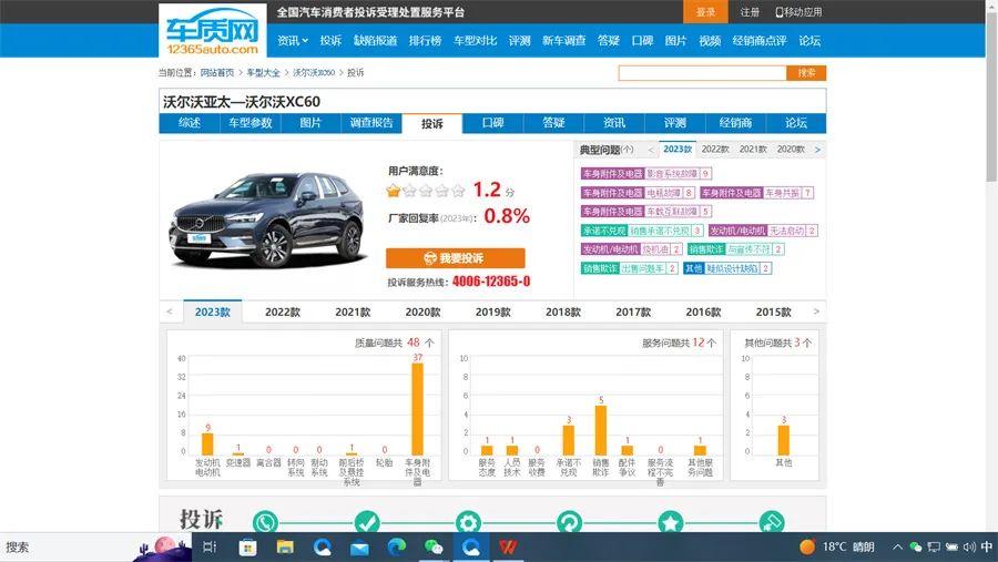 至于原因,前文所述的新车出现车机故障,旗下车型大面积出现的车门爆漆问题,或许也是其中之一。值得一提的是,其实车门爆漆问题的背后还暗藏另一个原因,即沃尔沃的冷漠。以车门爆漆问题严重的XC60为例,车质网的投诉界面显示,在2023年,沃尔沃的投诉回复率为0.8%。