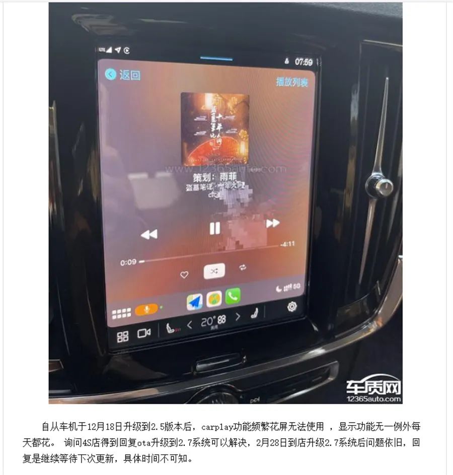 但这还不是孤例,一位2023款沃尔沃S90智逸豪华版(插混)车主在投诉中表示,自从车机于12月18日升级到2.5版本后,carplay功能频繁花屏无法使用,显示功能无一例外每天都花。另据该车主透露,在4S店升级后,问题依旧。