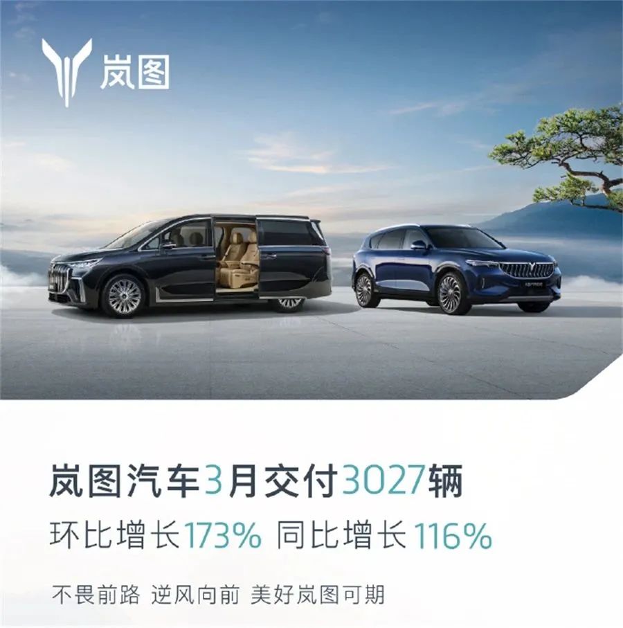 2022年12月15日,岚图追光正式发布,首月订单超过10000辆。据悉,追光是岚图打造的第三款车型,其已开启预售,共3款车型,价格区间为32.29-43.29万元,底盘采用前双叉臂+后五连杆独立悬架,并且还配备CDC电磁悬架,强化车辆的驾控性能,具备双电机四驱系统,也许正是由于这样的规格,才让岚图认为,追光对比保时捷、奥迪、蔚来和极氪等性能车时,并不落下风。此外,岚图汽车3月交付新车3027辆,同比增长116%,环比增长173%。