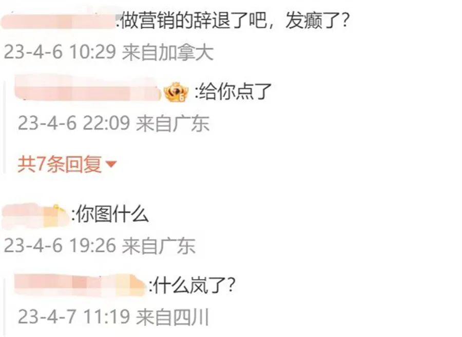 微博发出后,迎来不少网友的关注,大部分网友都表达了不理解,评论道:“做营销的辞退了吧?”或是模仿该句式进行调侃:“你图什么?”、“什么岚了”。