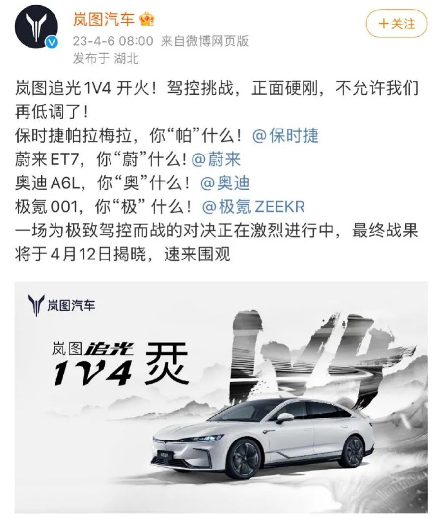 【文/财圈社&道哥说车 胡婧】4月6号早上8点,岚图汽车官方微博发布一条博文,称:“岚图追光1V4开火!驾控挑战,正面硬刚,不允许我们再低调了!”