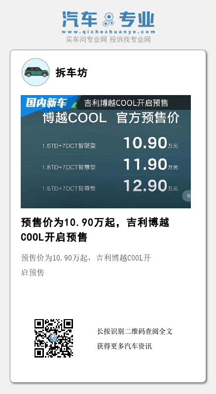 近日,我们获悉,吉利博越(图片|配置|询价)COOL正式开启预售,推出3款车型,预售价为10.90-12.90万元。