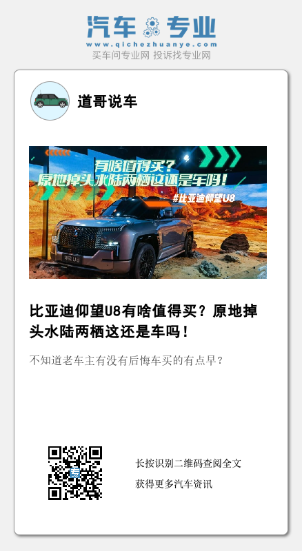 能跋山的车咱们见得多了那能涉水的车可真少见,更别说原地掉头了,这是什么骚操作!今天咱们就聊聊这个不按套路出牌的比亚迪仰望U8。仰望U8搭载了比亚迪最新的云辇- P系统,四个轮子可以独立提供动力,转向,还可以独立升降,任何路段都可以保持车身平衡和稳定,这就是云辇,真绝了!这套云辇系统分为云辇- A、云辇- C和云辇- P,分别搭配不同的车型,腾势N7、比亚迪汉EV和仰望U8。不知道老车主有没有后悔车买的有点早啊。