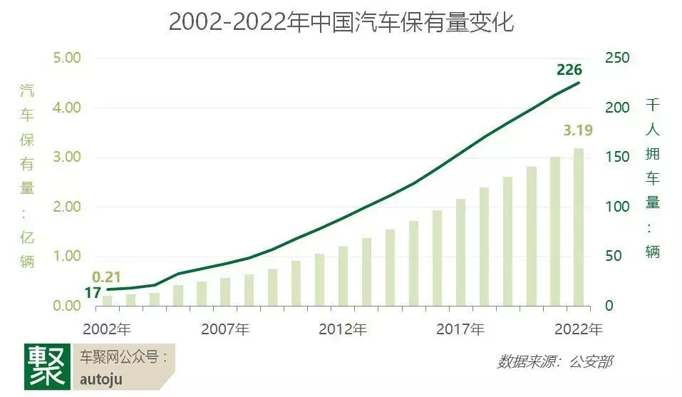 同样据公安部统计,2022 年全国汽车保有量已达 3.19 亿辆,结合 14.11 亿人口计算,中国千人拥车量达 226 辆。