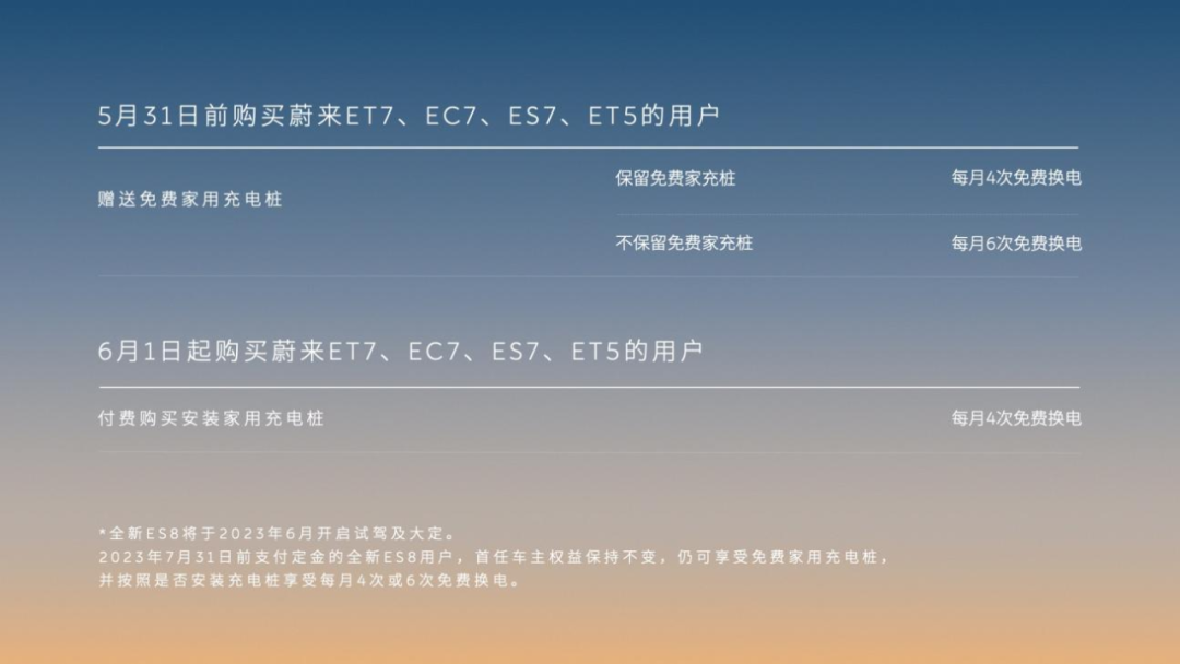 根据蔚来最新换电权益调整,自6月1日起支付定金购买蔚来ET7、ES7、EC7和ET5车型的首任车主,充电桩将调整为付费购买安装,每月免费换电次数统一调整为4次。在5月31日(含)前支付定金购买上述车型,及7月31日(含)前支付定金购买全新ES8车型的用户,首任车主权益保持不变,仍按照是否安装免费充电桩享受每月4次或6次免费换电。