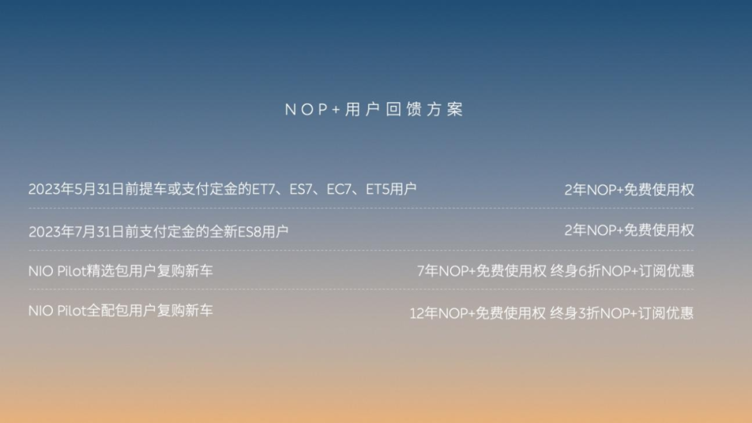 此次权益调整的另一个重点在于,蔚来宣布辅助驾驶NOP+Beta免费试用将于今年6月30日结束,7月1日起NOP+将升级为正式版并开启按月订阅的模式,订阅价格为380元/月。但蔚来方面却认为这是帮车主省钱了,或者说也是一种为用户考虑的做法。