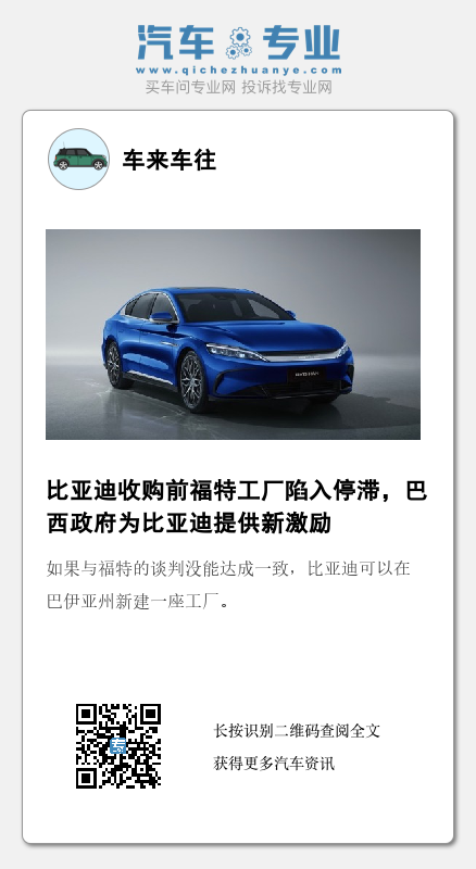拒绝透露身份的消息人士在谈到比亚迪与巴西代表团的会谈时说,比亚迪将继续与福特汽车谈判,以接管在2021年关闭的巴伊亚工厂,并继承巴西对该工厂的税收优惠。