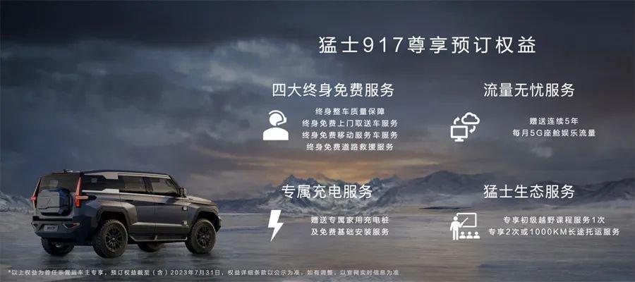 在全球首发的同时,猛士917正式开启预订,70万元-160万元的预售价格,年内限量发售1687台,情理之中又有点小惊喜,撩动消费者向往自由与豪华越野之心。2023年7月31日内预订猛士917的用户,更可获得四大终身免费服务、专属充电服务等多项尊崇专享礼遇。这是在告诉为猛士917心动的消费者,要下手还得趁早,接下来3个多月是最佳下手时机。下半年,猛士917将正式上市并陆续交付用户。