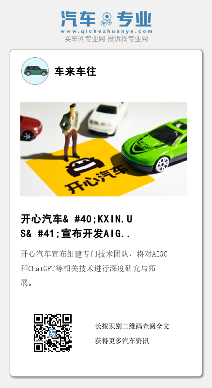 开心汽车宣布组建专门技术团队,将对AIGC和ChatGPT等相关技术进行深度研究与拓展。