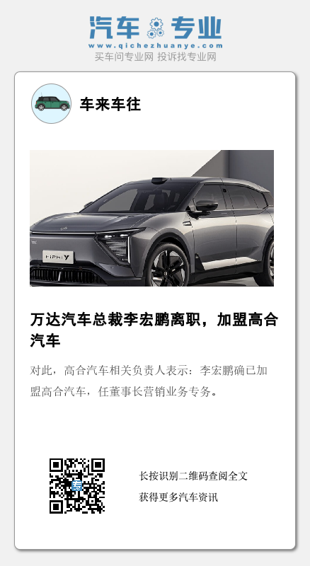 对此,高合汽车相关负责人表示:李宏鹏确已加盟高合汽车,任董事长营销业务专务。