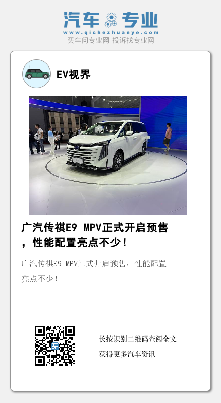 【EV视界报道】最新消息透露,广汽传祺 E9将于5月正式上市。此前在上海车展上已经开始预售,售价预计区间为33-39万元。